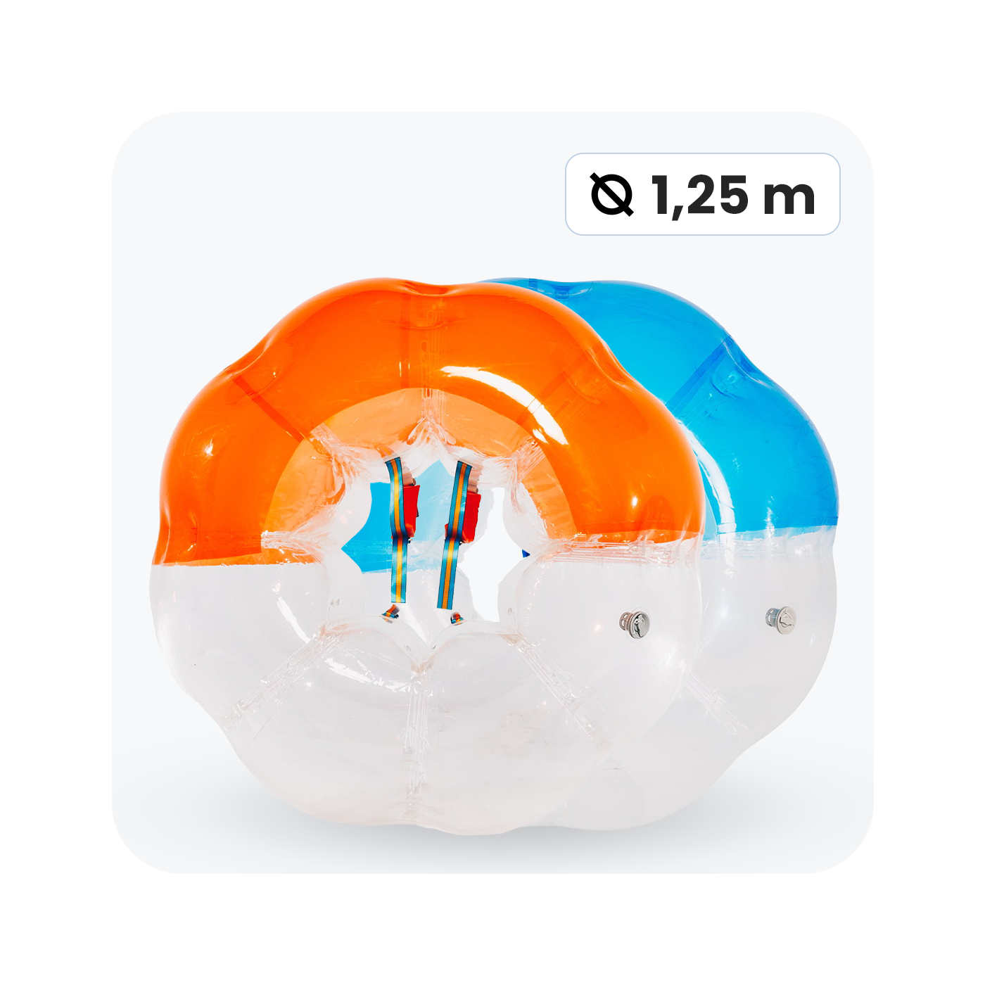 Bumper Ball Premium 1,25 m – Sada nafukovacích koulí z TPU je zárukou bezpečné a prvotřídní zábavy. Atrakce byla vytvořena pro všechny, kteří milují týmové hry a skvělou zábavu. Nafukovací koule Bumper Ball využijete při akcích konaných na čerstvém vzduchu. Bumper Ball jsou také ideální pro kryté sportovní haly. Nafukovací koule Bumper Ball je tak velká, že se do ní vejdete. Uvnitř se nacházejí nastavitelné popruhy, které zajišťují bezpečné používání. Díky tomuto řešení si v nafukovací kouli Bumper Ball mohou zahrát všichni účastníci akce i přes výškové rozdíly mezi jednotlivými hráči. Můžete běhat, závodit, narážet při tom do ostatních hráčů a přitom se skvěle bavit. Pokud hledáte způsob, jak strávit čas s přáteli nebo rodinou, nafukovací koule Bumper Ball budou trefou do černého. Tento produkt můžete najít pod různými názvy – Bubble Football, Bubble Soccer nebo Bumper Ball. Ať už však hru nazveme jakkoli, jedno je jisté – týmová zábava v nafukovacích koulích Bumper Ball přinese všem účastníkům akce spoustu radosti a zábavy na dlouhé hodiny.