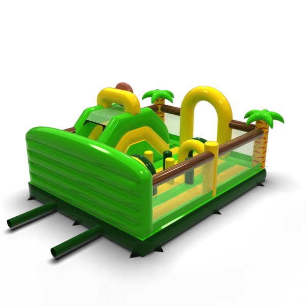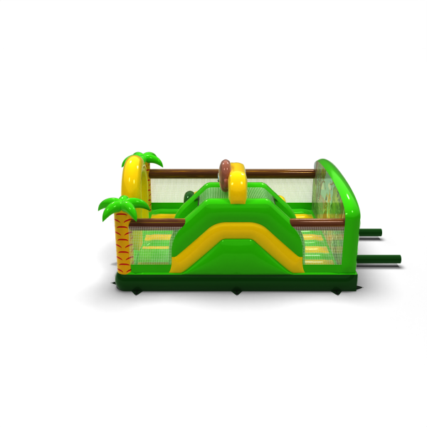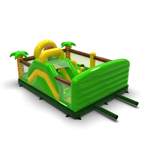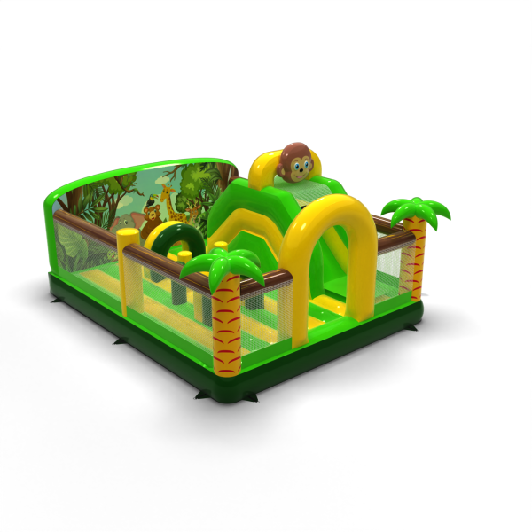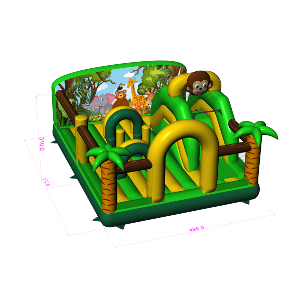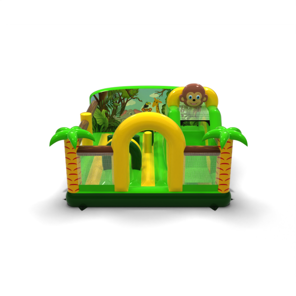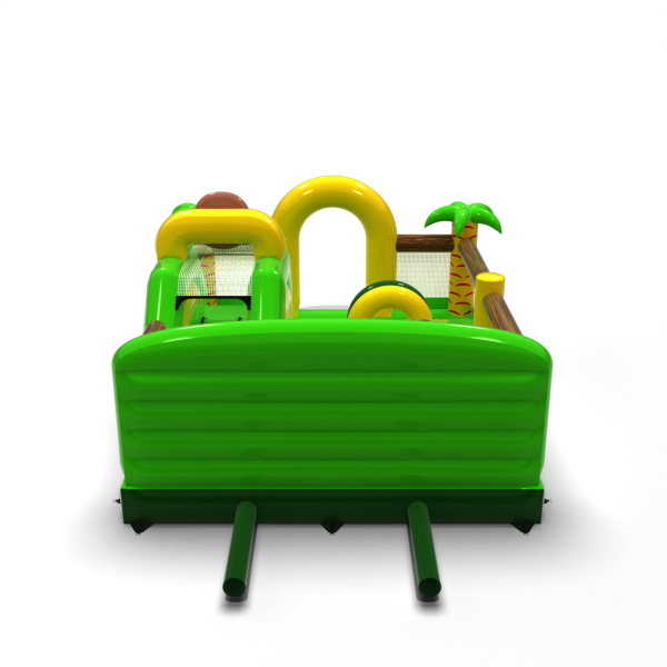 Nafukovací hřiště 6x5 s motivem džungle je ideální atrakcí pro zábavní parky, venkovní prostory a rodinné akce. Zelenožluté barevné provedení, palma a usměvavá opice vytvářejí ucelené prostředí, které okamžitě upoutá dětské oči. Konstrukce kombinuje překážkovou dráhu, skluzavku a skákací prostor pro dynamickou hru v bezpečném prostředí. Průhledné sítě usnadňují dohled nad skupinou a kompaktní tvar umožňuje efektivní manipulaci i v hustém provozu. Rozhodněte se pro motiv, který promění každou akci ve skutečné dobrodružství uprostřed divočiny.