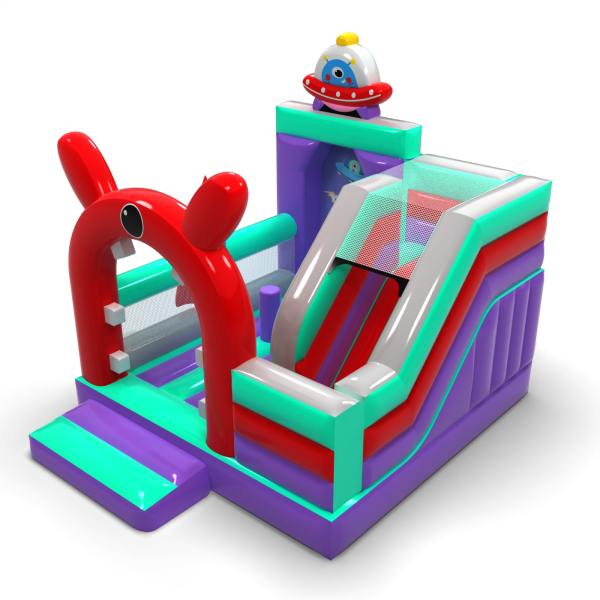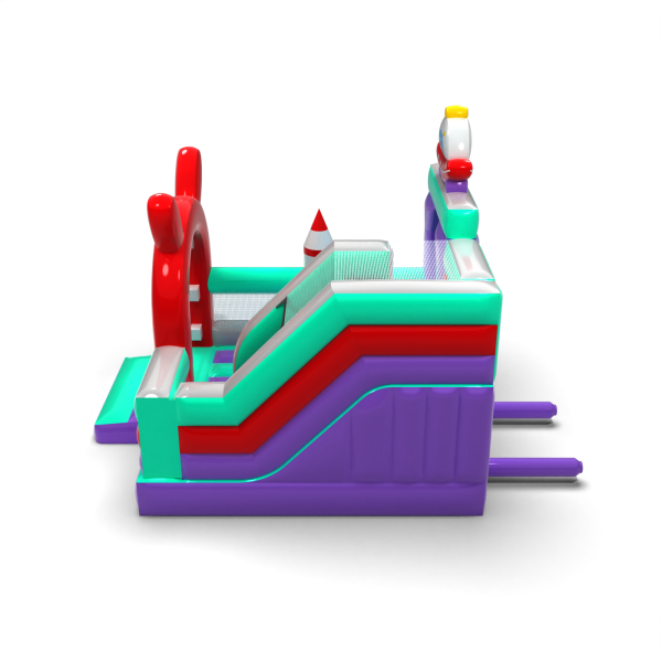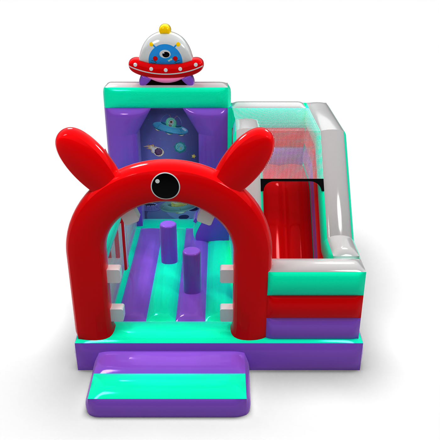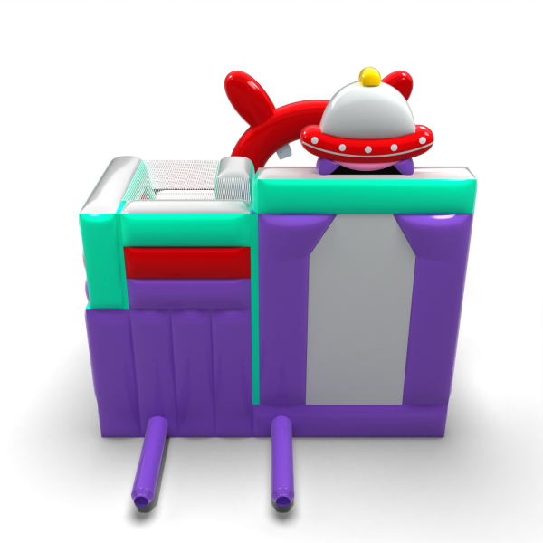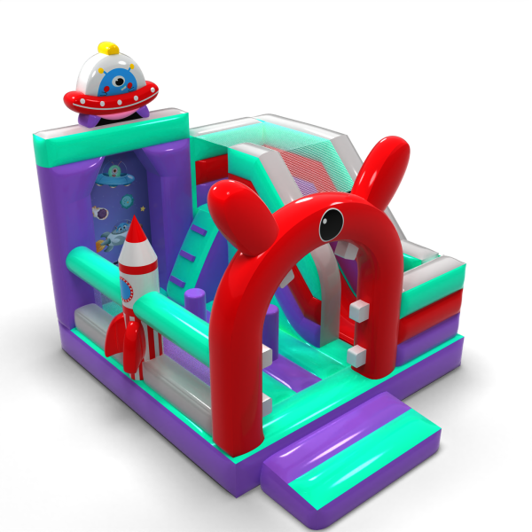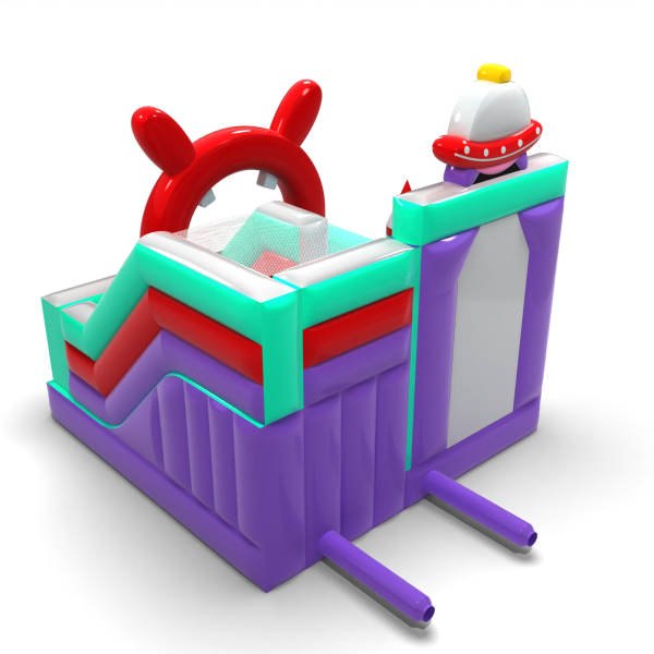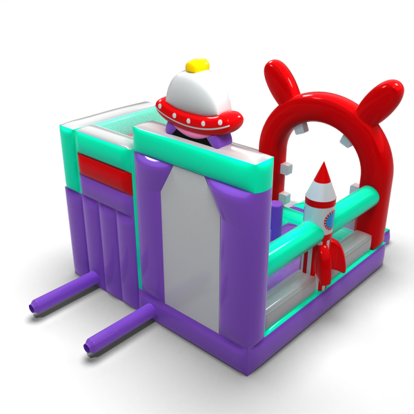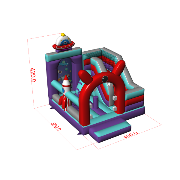 Nafukovací kombo s vesmírnou tématikou kombinuje funkce hradu, skákací plochy a skluzavky, což z něj činí mimořádně všestrannou atrakci pro děti. Motiv rakety a ufonů je poutavý a ideální pro scénáře moderních akcí. Konstrukce umožňuje hru několika dětí najednou, což se projevuje vysokou efektivitou při pronájmu. Skvělá volba pro venkovní akce, tematické pikniky a akce ve vnitřních prostorách.