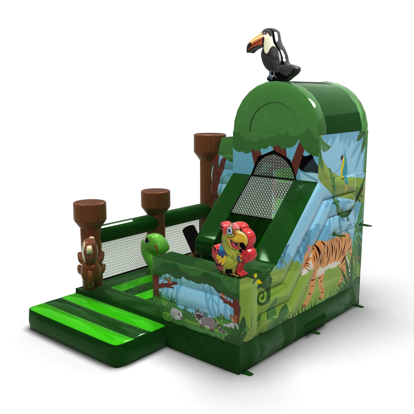 Objevte divoké dobrodružství v srdci džungle s naší nafukovací skluzavkou s barevným motivem džungle! Dopřejte svým malým objevitelům nezapomenutelné chvíle plné radosti a zábavy v bezpečném prostředí. Jedná se o dokonalý doplněk pro venkovní akce a slavnosti, který děti potěší a vykouzlí jim spoustu úsměvů na tváři!
