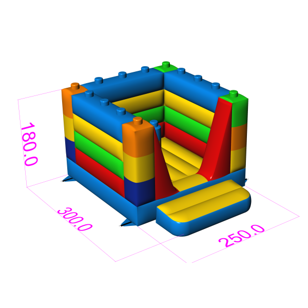 Vizuálně atraktivní skákací hrad, který připomíná konstrukci z velkých barevných kostek. Jednoduchý tvar a nízká výška (180 cm) umožňují atrakci bez problémů postavit i v interiéru. Dobře se uplatní na rodinných akcích, v restauracích s dětským koutkem nebo v hotelových animačních prostorách.