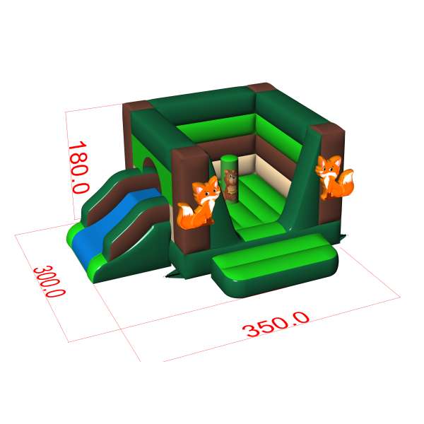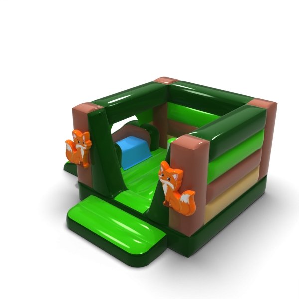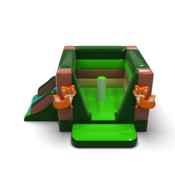 Tato verze skákacího hradu byla obohacena o malou skluzavku, která prodlužuje dobu a atraktivitu hry. Zeleno-hnědé barevné provedení připomíná les a motiv lišky dodává konstrukci přátelský nádech. Díky svým kompaktním rozměrům se dobře uplatní jak venku, tak v menších místnostech. Zajistěte si moderní ústřední bod, který snadno přizpůsobíte různým scénářům akcí.