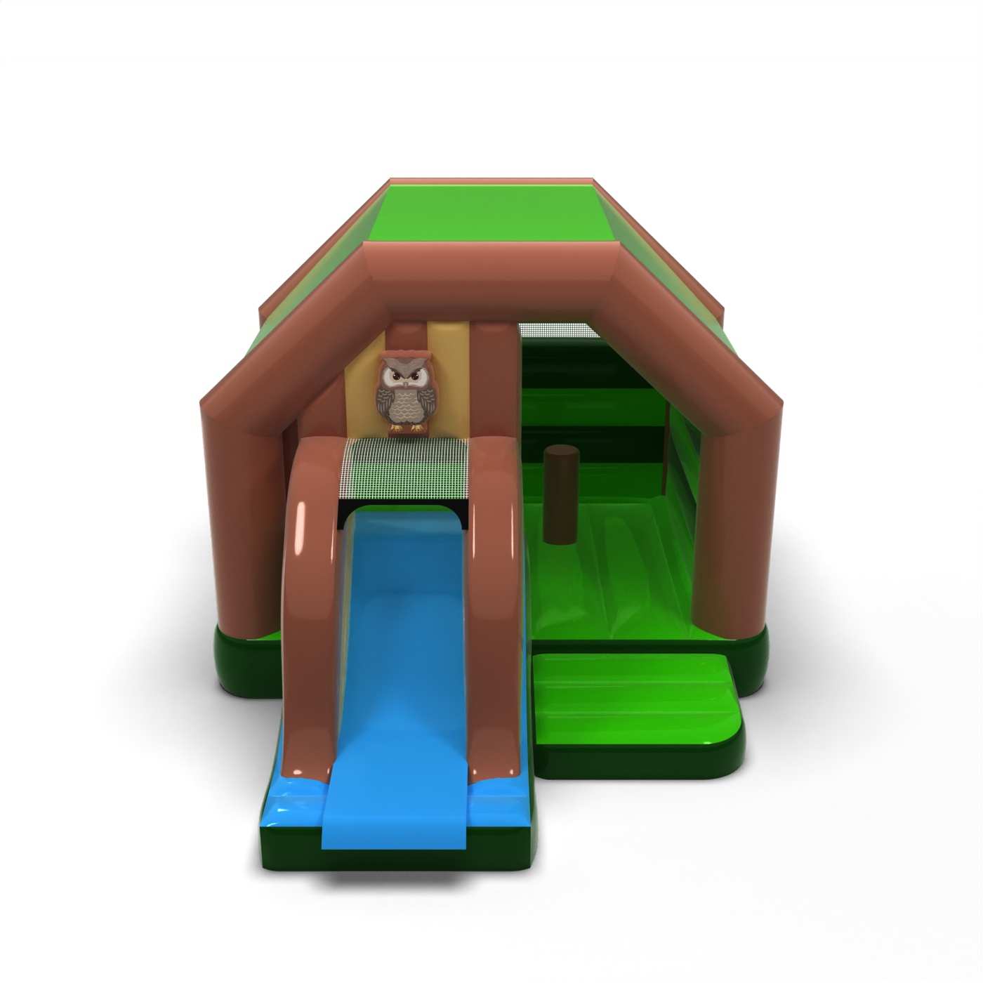 Forma inspirovaná lesem vytváří jasně ohraničený tematický hrací prostor, který působí klidným a přirozeným dojmem. Kombinace skákacího a klouzacího prostoru vybízí děti k pohybu a delšímu užívání si atrakcí. Lesní design navozuje atmosféru blízkosti přírody a dobře funguje při venkovních rodinných akcích. Je to návrh pro organizátory, kteří chtějí vytvořit soudržnou, přátelskou dětskou zónu bez intenzivní, slavnostní dynamiky. Atrakce se bude skvěle hodit pro pikniky, festivaly a animace konané venku.