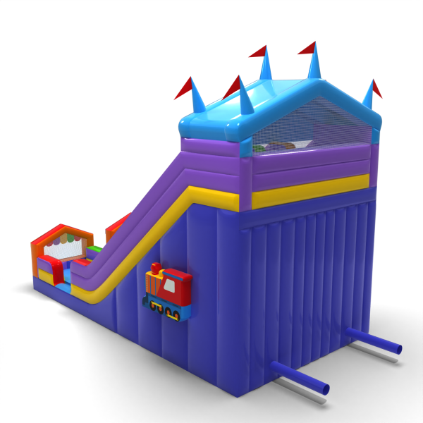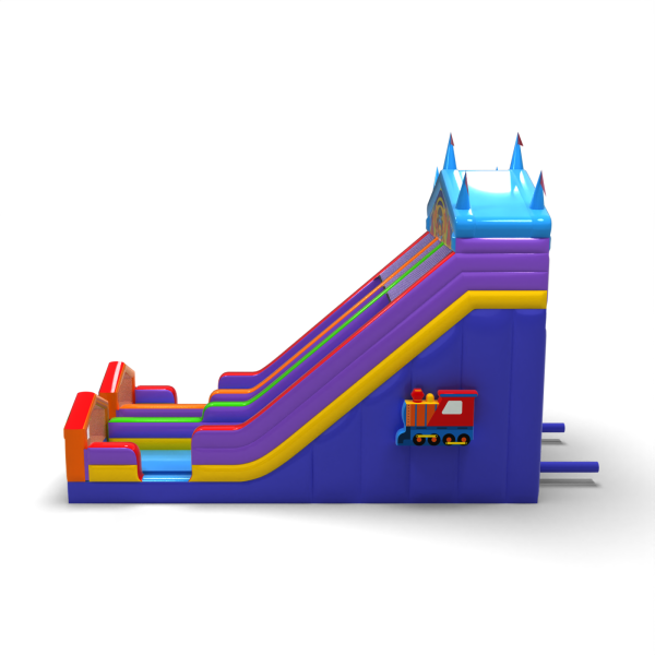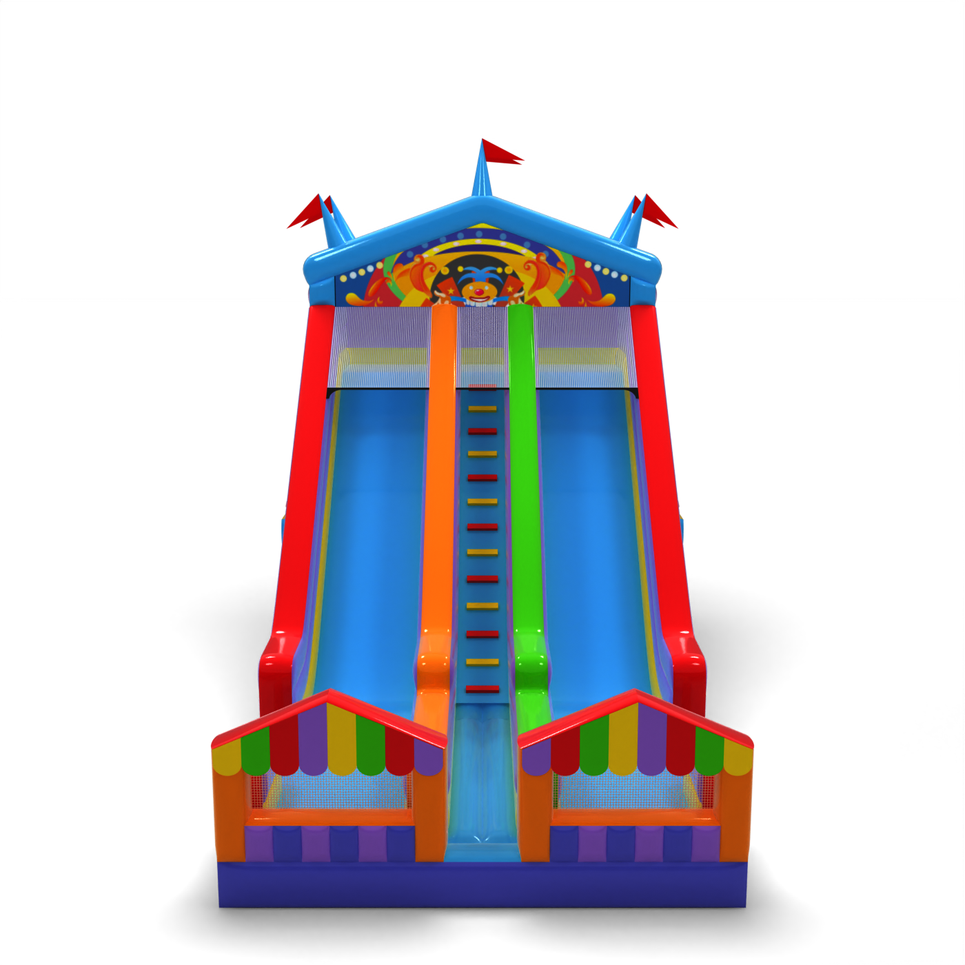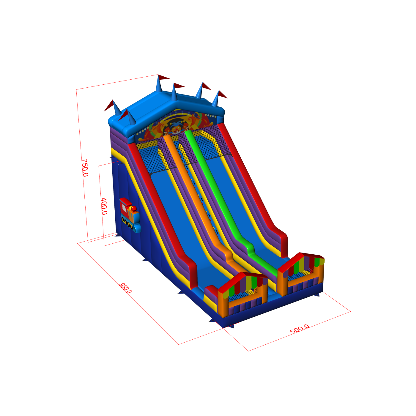 Skluzavka inspirovaná lunaparkem je klasika zábavy s moderním nádechem. Díky sytým barvám, cirkusové stříšce a grafice ve stylu lunaparku vypadá konstrukce skvěle už z dálky. Dvě dráhy umožňují rychlé střídání účastníků a robustní konstrukce se dobře hodí k pronájmu po celou sezónu. Tento model je jako stvořený pro festivaly, městské pikniky a masové akce.