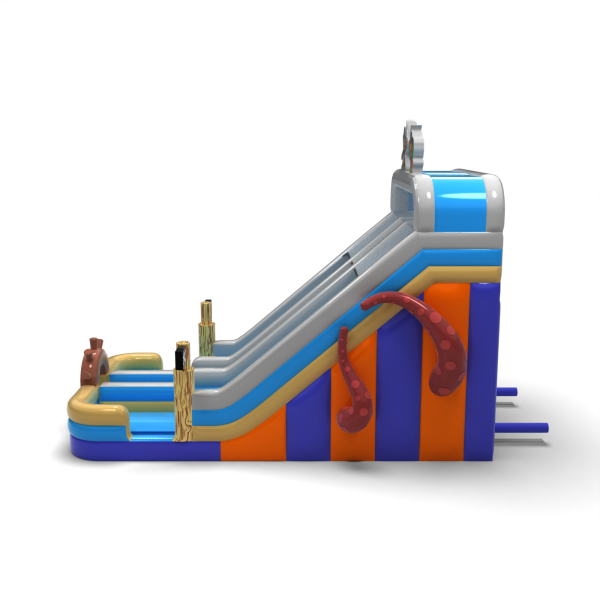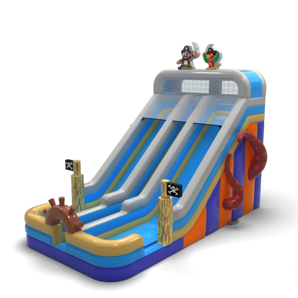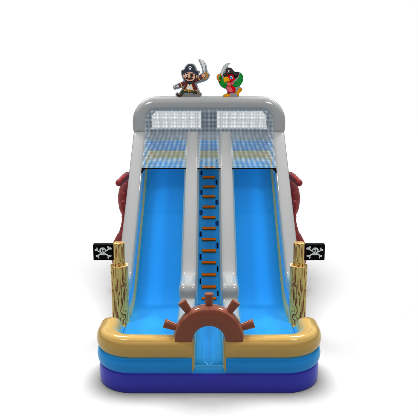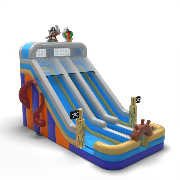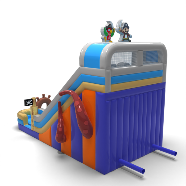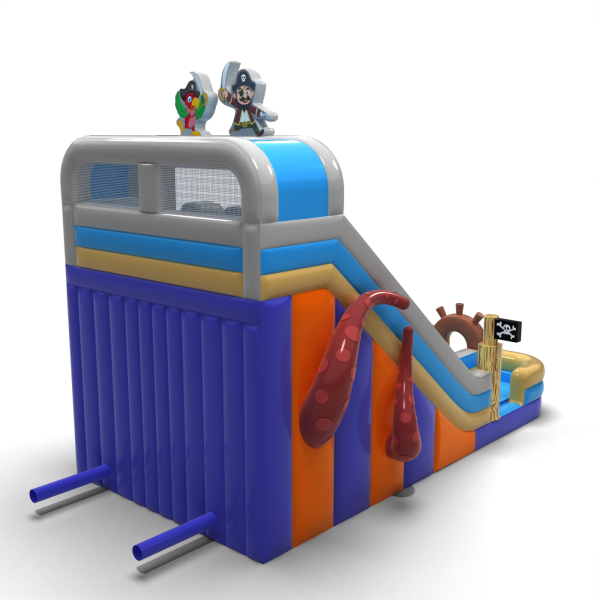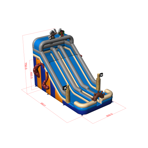 Dvojitá skluzavka v pirátském stylu je určena pro malé dobrodruhy. Dekorace v podobě vlajek, kormidel a chobotnice dodávají atrakci námořnickou atmosféru, která je ideální pro tematické venkovní akce. Dvě nezávislé dráhy skluzavky zvyšují kapacitu a zkracují čekací dobu. Model je ideální pro firmy zajišťující stravování na festivalech, městských akcích a rodinných venkovních akcích.