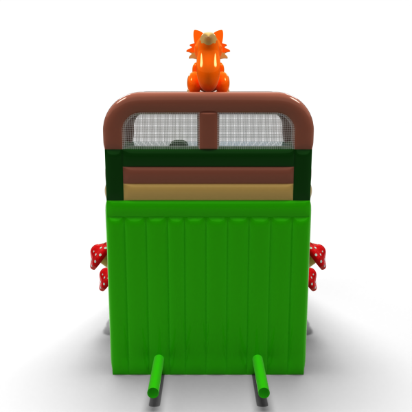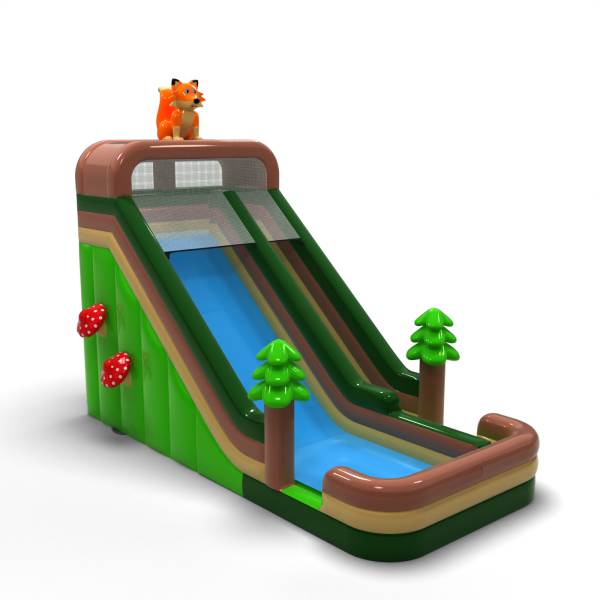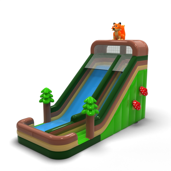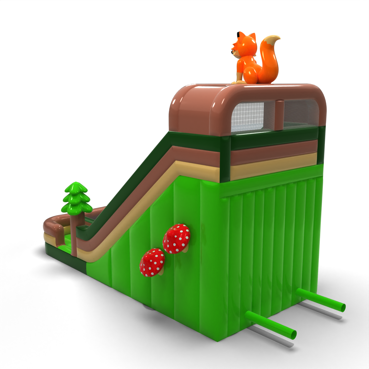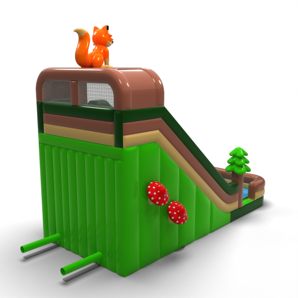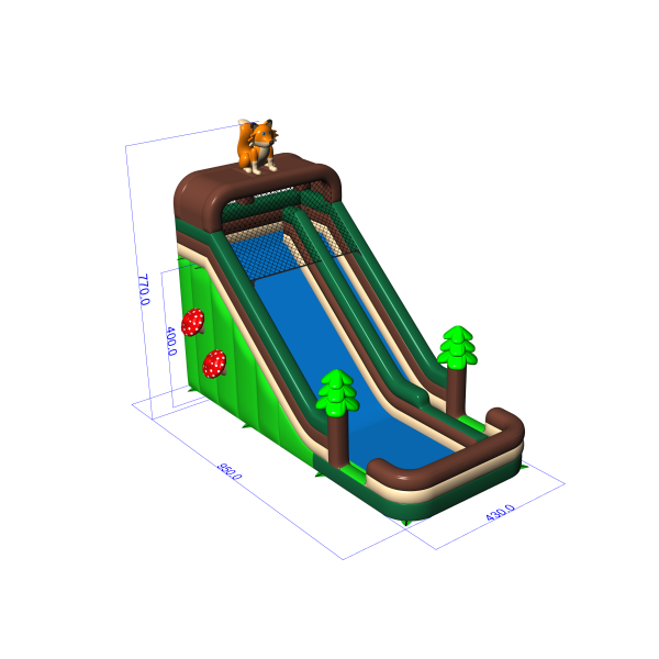 Skluzavka v lesním stylu s dekoracemi v podobě stromů, hub a přátelské lišky na vrcholu je atrakcí, která dokonale zapadá do zeleného prostředí venkovních akcí. Přírodní barvy a vysoká konstrukce zajišťují silný vizuální efekt a bezpečnou, dynamickou zábavu. Model doporučený pro vzdělávací, ekologické nebo teambuildingové akce. Spolehlivá volba pro půjčovny a organizátory velkých rodinných akcí.