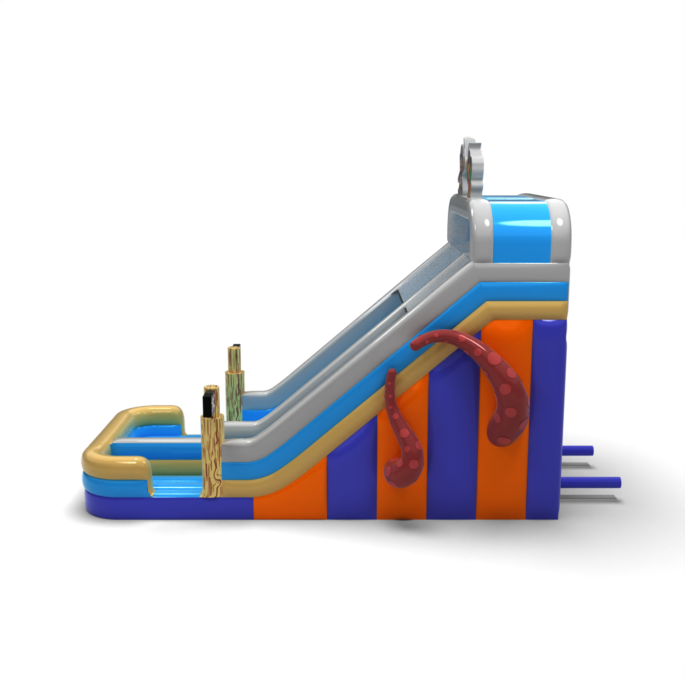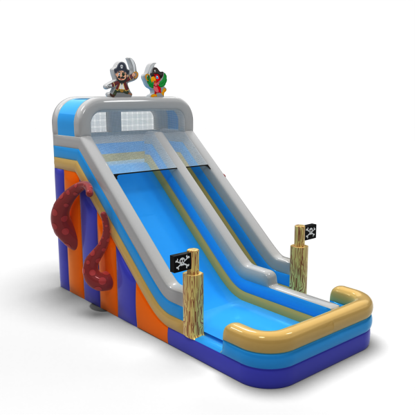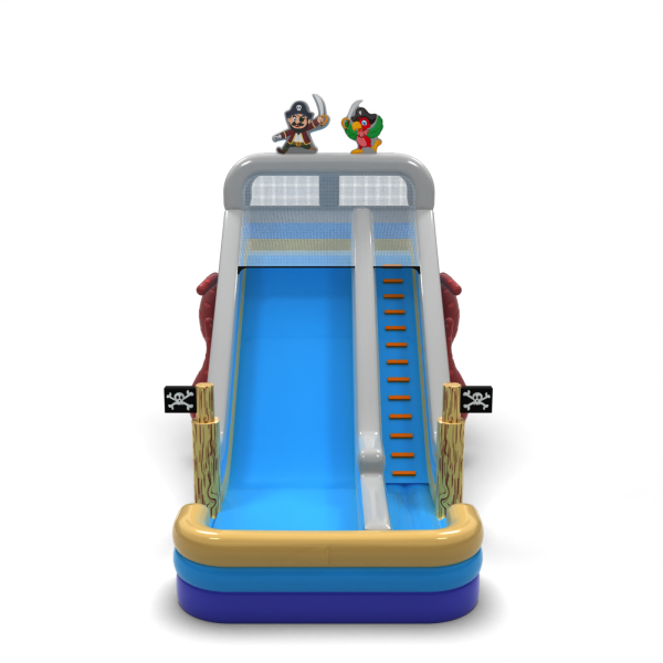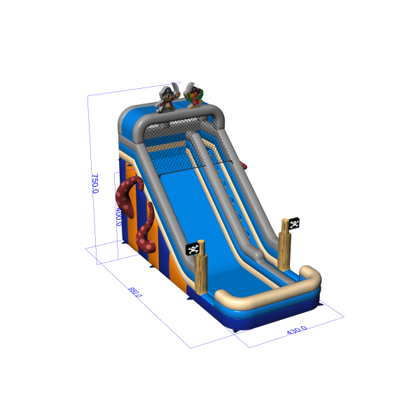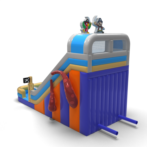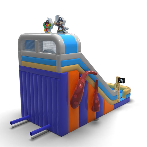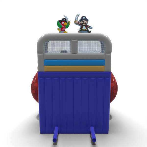 Skluzavka v pirátském stylu s výraznými postavami a dekoracemi lodi je ideální atrakcí pro tematické akce a letní venkovní párty. Barevné provedení v odstínech modré a béžové barvy odkazuje na námořnická dobrodružství a dekorativní detaily, jako jsou vlajky a chobotnice, přispívají k zábavné atmosféře. Konstrukce zajišťuje plynulý sestup a je ideální pro intenzivní použití na akcích.