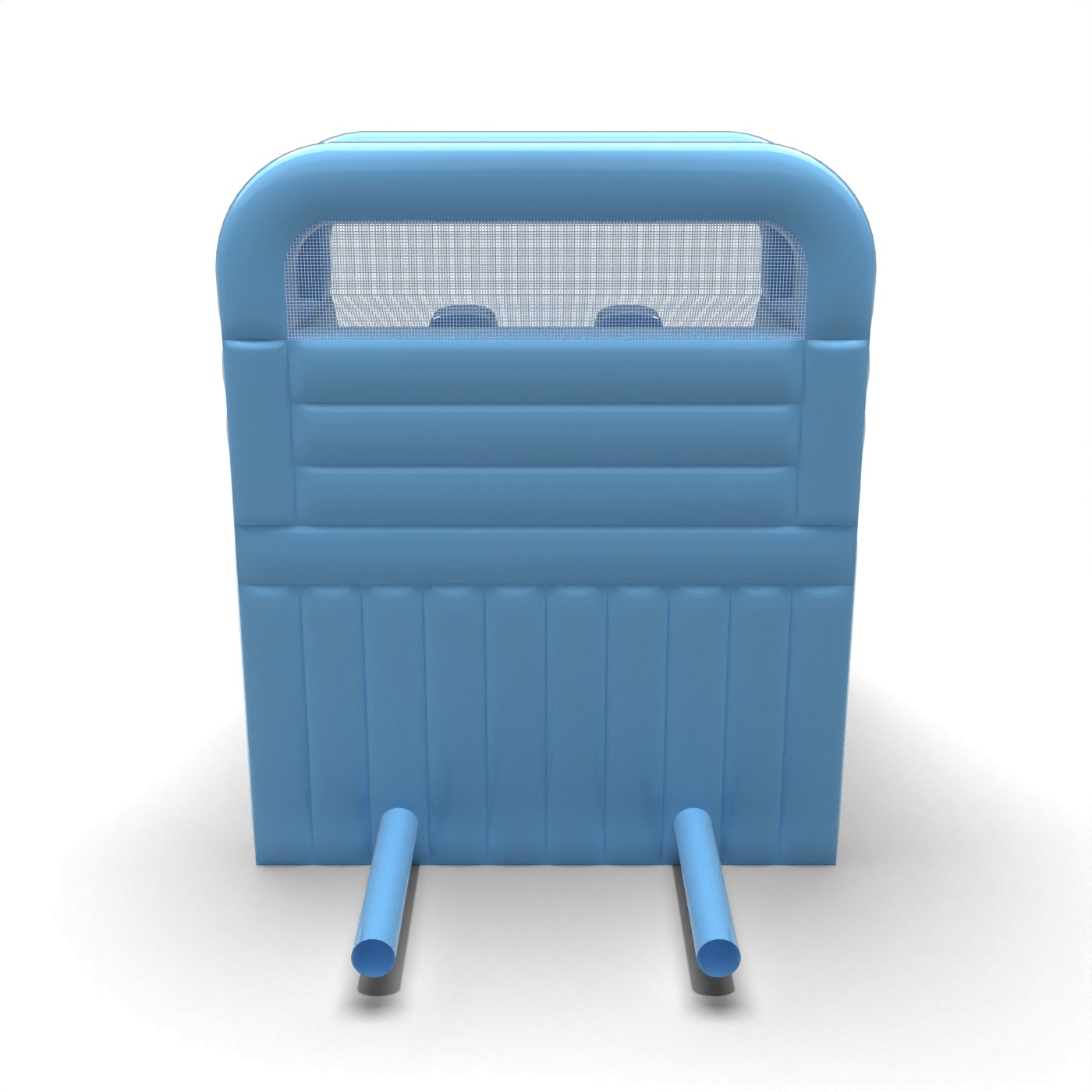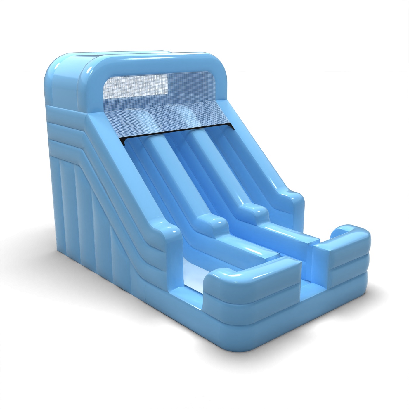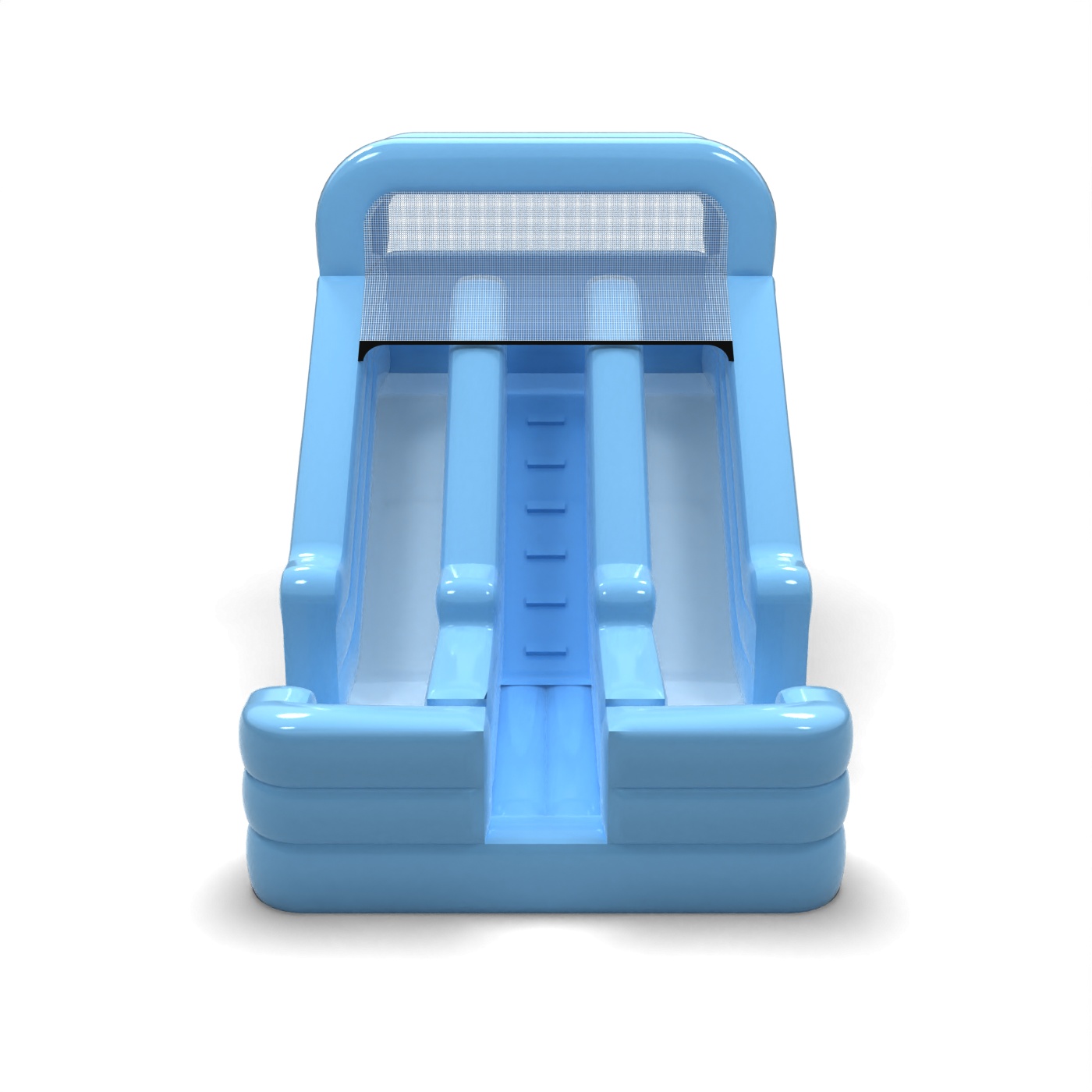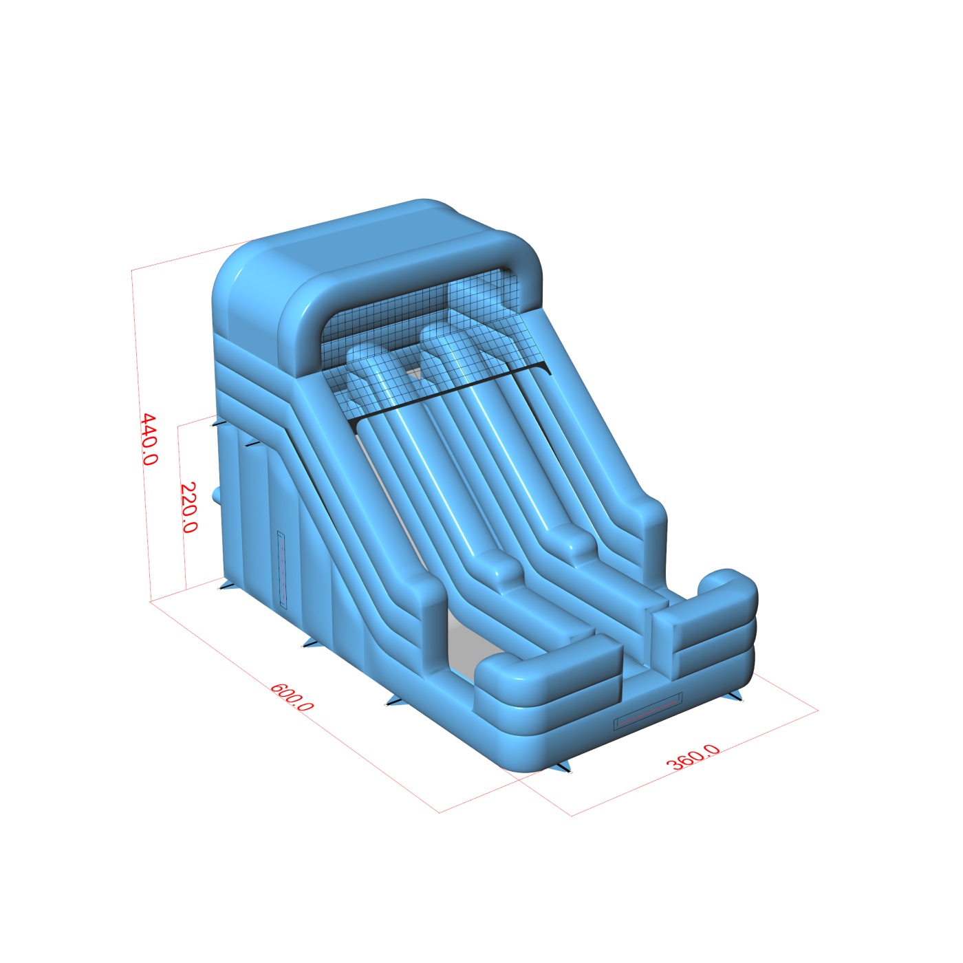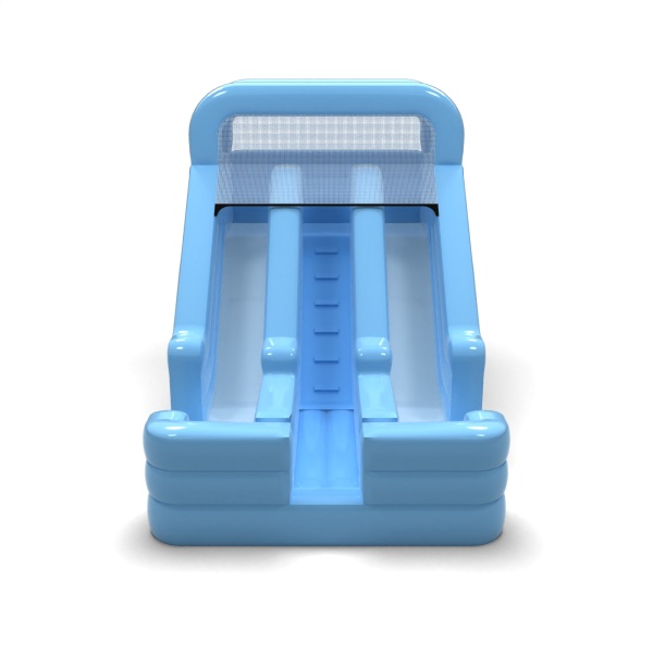 Pastelově modrá barva podtrhuje svěží a všestranný charakter tohoto dvojitého skluzu, který se snadno hodí do různých konceptů akcí. Souběžné skluzavky umožňují současnou hru, což zvyšuje tempo provedení a zkracuje prostoje v dětském prostoru. Kompaktní design s jasně vymezenou startovací plošinou umožňuje efektivní řízení pohybu účastníků. Jedná se o možnost pro eventové společnosti a půjčovny provozující dětské dny, firemní pikniky a školní venkovní akce. Model se osvědčí všude tam, kde je požadována viditelná, ale esteticky neutrální atrakce s dobrou průchodností.