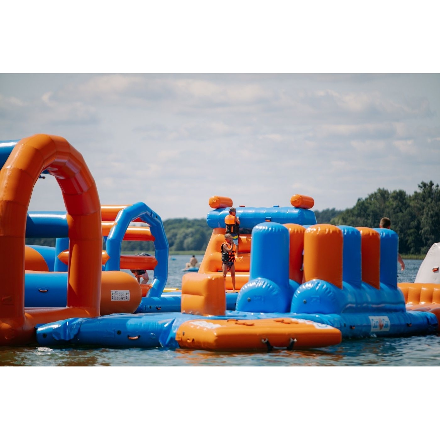 Nafukovací vodní park lze rozšířit o další překážkové dráhy, bójky, lezecké stěny a skluzavky. Nafukovací park můžete dále zatraktivnit balančními podložkami, nafukovacími polštáři, mosty, žebříky a mnoha dalšími prvky. Každý návštěvník parku by měl mít na sobě plovací vestu. Bohatě vybavený nafukovací vodní park pojme až 75 osob najednou! Vytvářejte skupiny, měřte časy, závoďte s přáteli a známými. Nafukovací vodní park je zcela bezpečný. Z případných pádů nemusíte mít vůbec strach – materiál je pružný a velmi měkký. Nafukovací vodní park je ideální řešení pro velké tematické akce. Skvěle se osvědčí také jako hlavní atrakce letních táborů. Vyberte si náš produkt a hrajte si celé hodiny. Nafukovací atrakce jsou k dispozici v různých barevných provedeních. Díky různým tvarům a provedením nafukovacího vodního parku se čas strávený na něm stane nezapomenutelným zážitkem. Nemůžeme vám zaručit dobré počasí, ale zaručíme nafukovací atrakce špičkové kvality, které přilákají zákazníky.