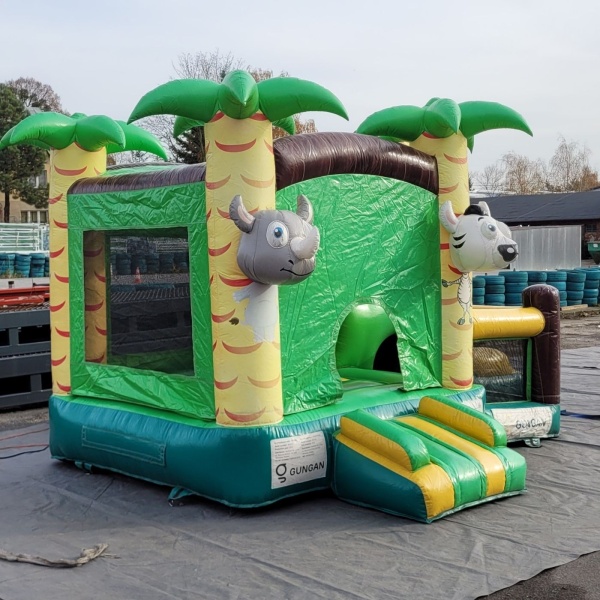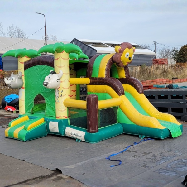 Nafukovací kombi s motivem džungle kombinuje funkci skákání a klouzání a hodí se na rodinné akce a pikniky. Atrakce byla pravidelně využívána při komerčních akcích. Technický stav je popsán jako zjevně používaný - jsou na něm patrné známky používání odpovídající intenzivnímu používání. Jedná se o rozumnou nabídku pro firmy, které hledají funkční nafukovací atrakci s nižším investičním rozpočtem. Pro více informací, fotografií a záběrů z výrobku nás prosím kontaktujte.